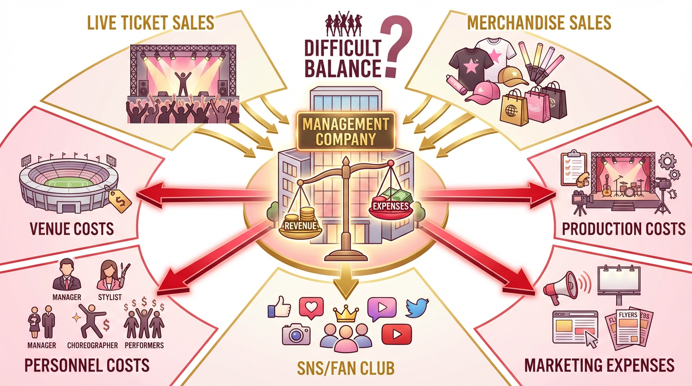 ファンから見れば「ライブが盛り上がっている=儲かっている」と思いがちだが、実際にはその多くが“投資的支出”であり、キャッシュフローの綱渡り状態で運営されているのが現実だ。