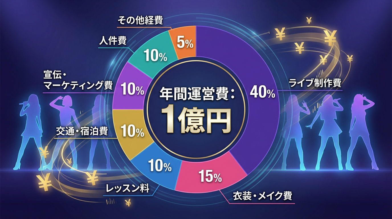 これに加えて、メンバーの衣装制作費(1人あたり年間50万円〜100万円)、ダンス・ボーカルレッスン料(月10万円前後×6人で年間720万円)、交通・宿泊費などを合算すれば、年間運営費は優に5,000万円を超える。