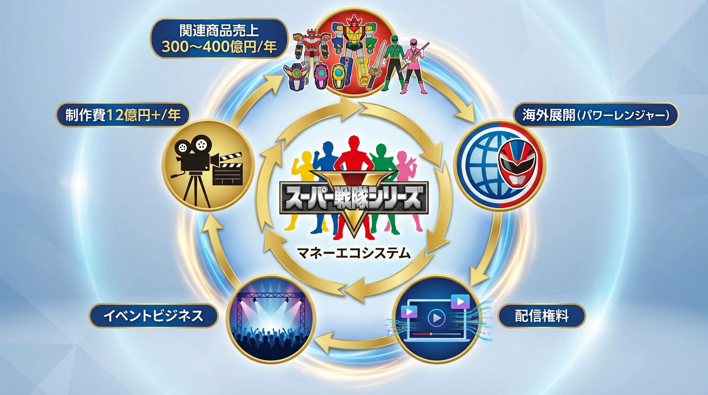 このように、スーパー戦隊は“番組を核にしたメディアミックス戦略”が確立されており、毎年1つのシリーズが終わっても、次のシリーズへと資産が自動的に循環していく“マネーエコシステム”を構築している。