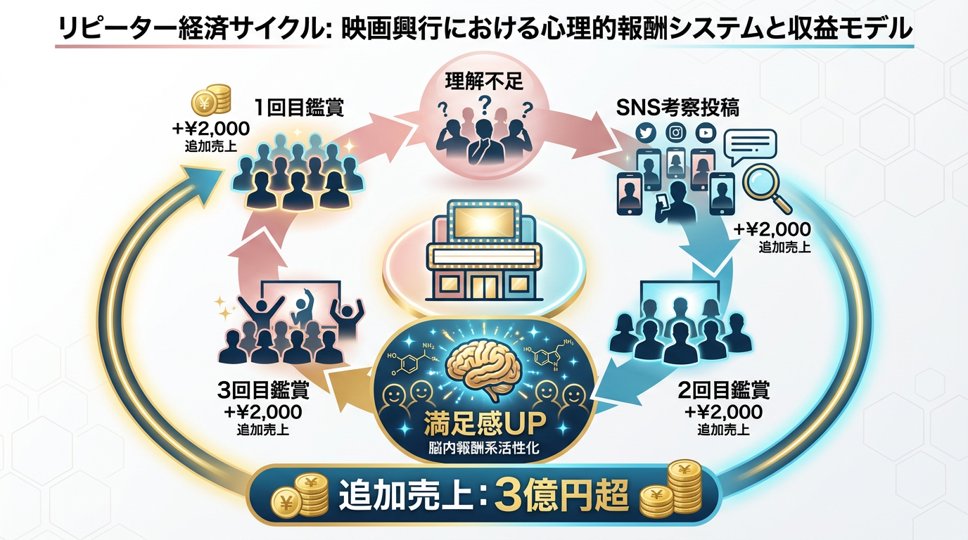 心理的報酬 × SNS拡散 × 低コスト高利益──これが映画『爆弾』のリピーター経済の三大要素である。