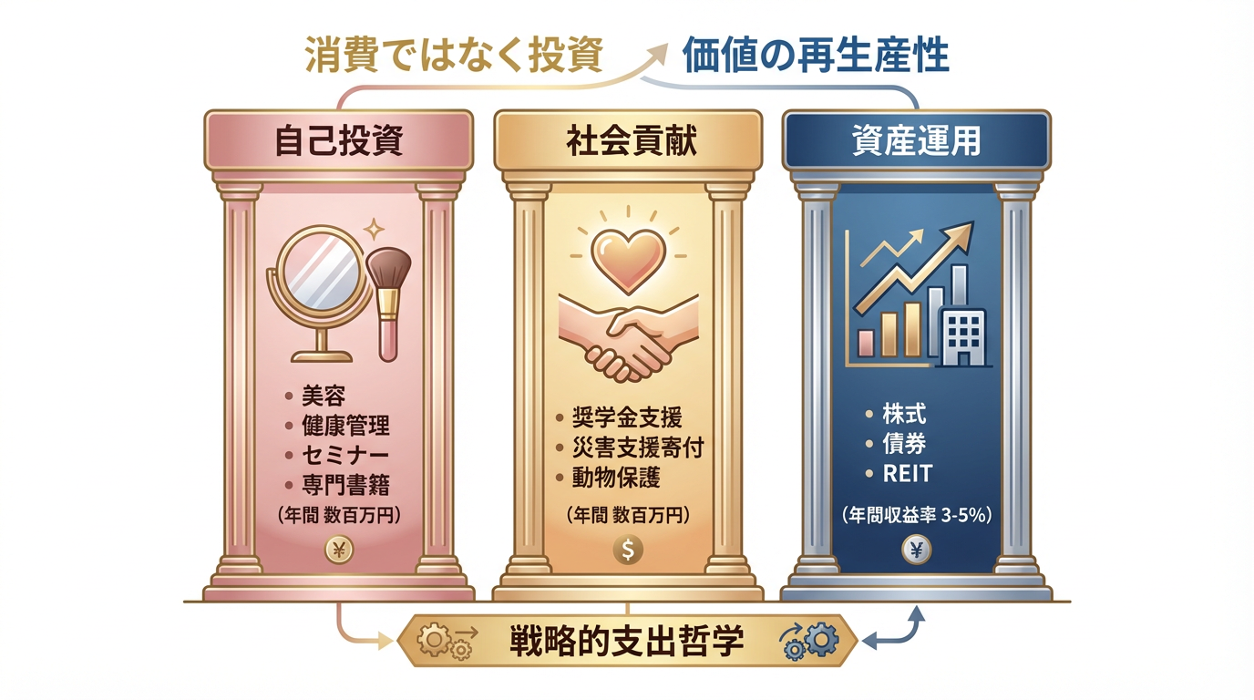 貯め込むよりも“循環させる”ことを重視し、美容・ビジネス・社会貢献といった複数の分野に資金を分散させている。